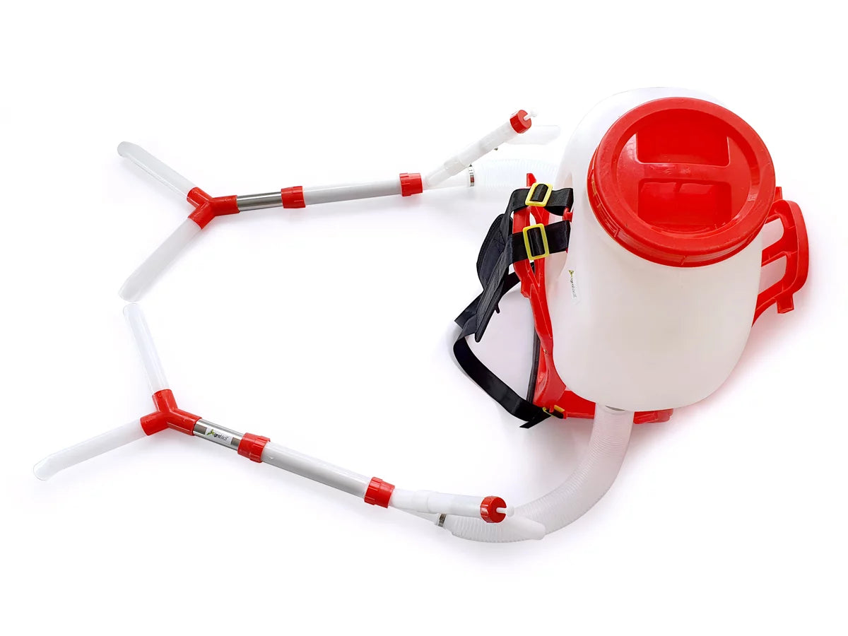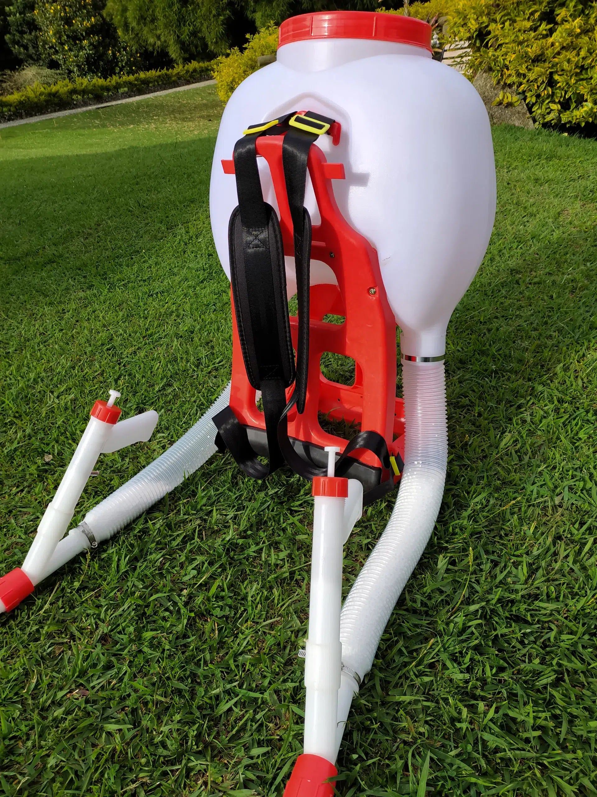 - Equipo ergonómico ajustable en altura (correas) tipo mochila para espalda que evita el contacto de la piel con el fertilizante.