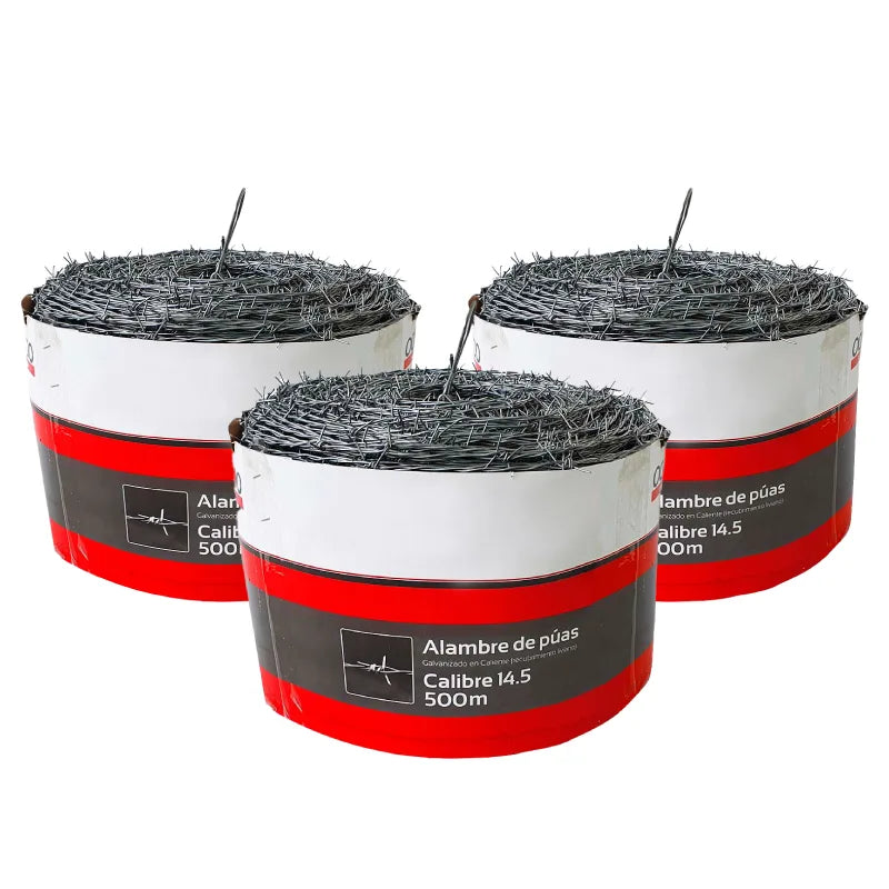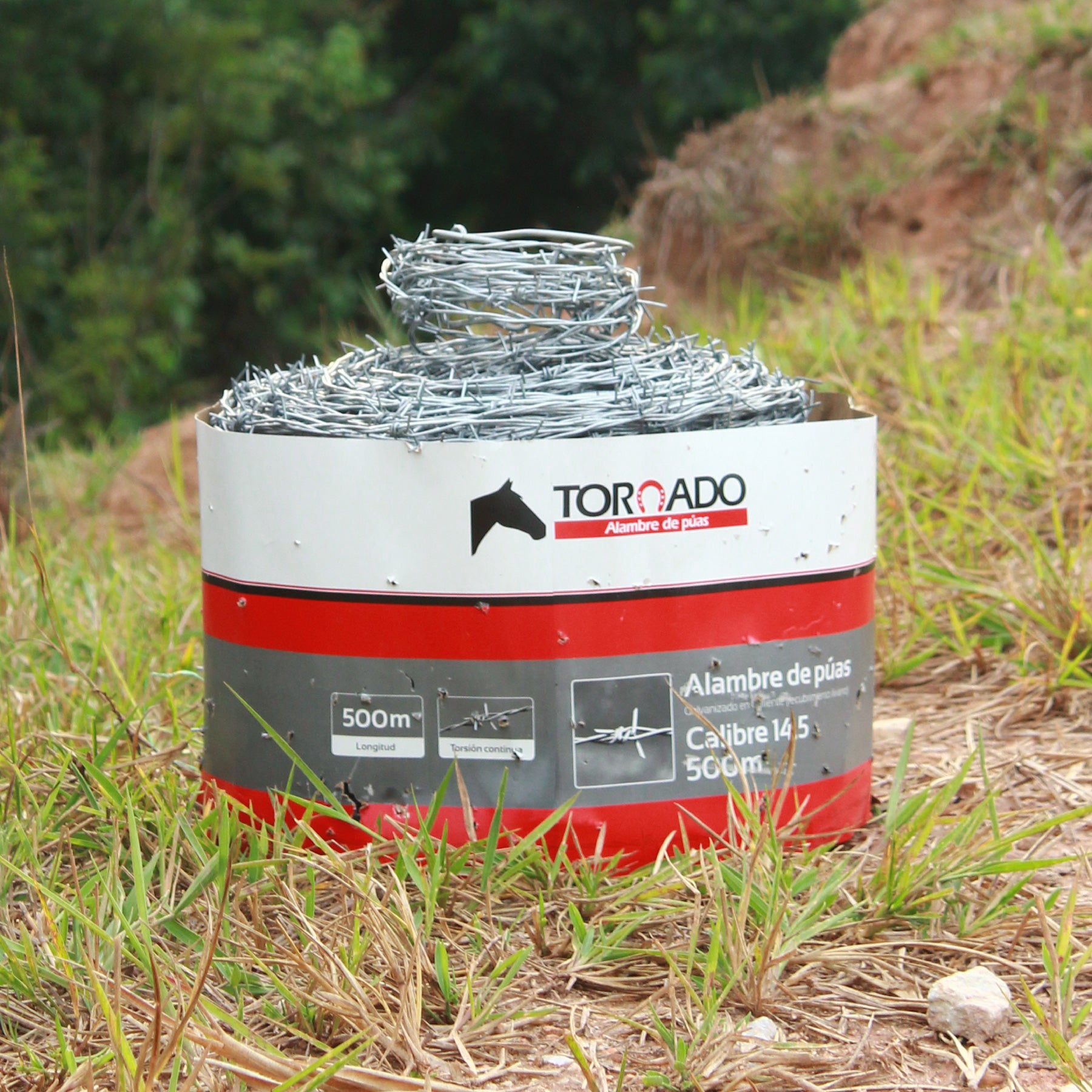 - Alambre de púas con recubrimiento en zinc, resistente y de fácil manejo.