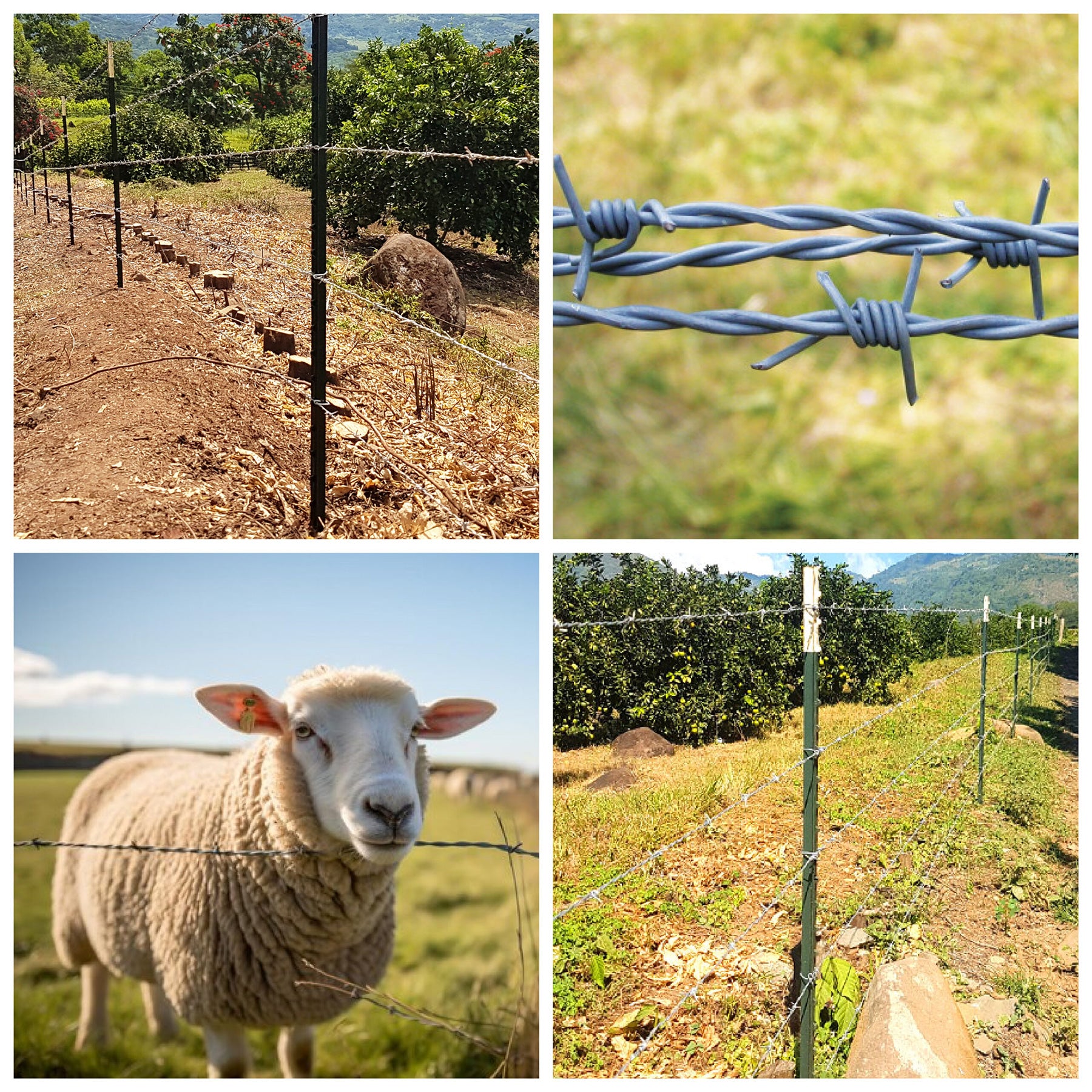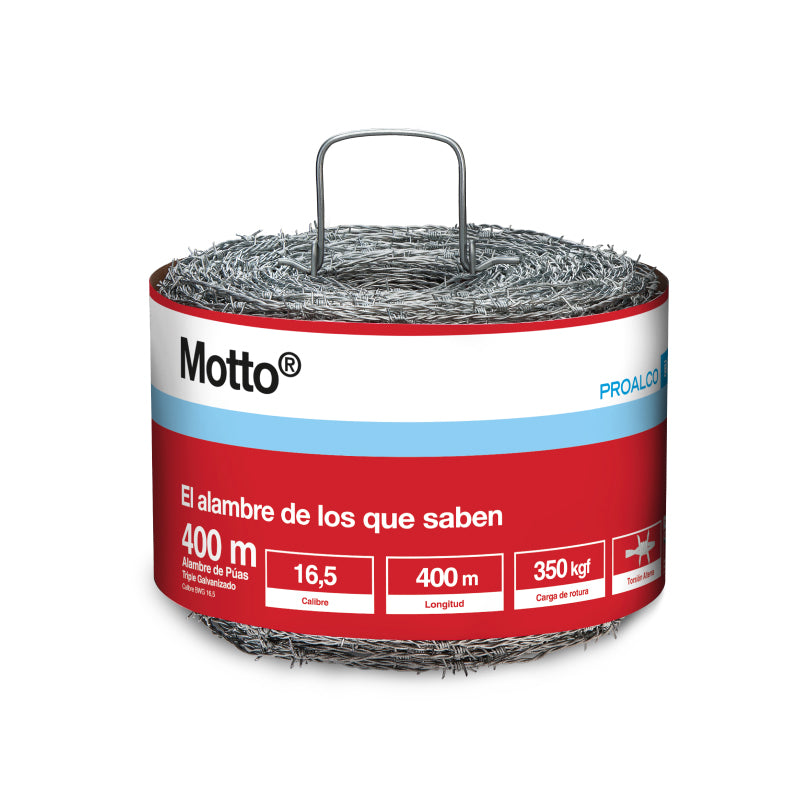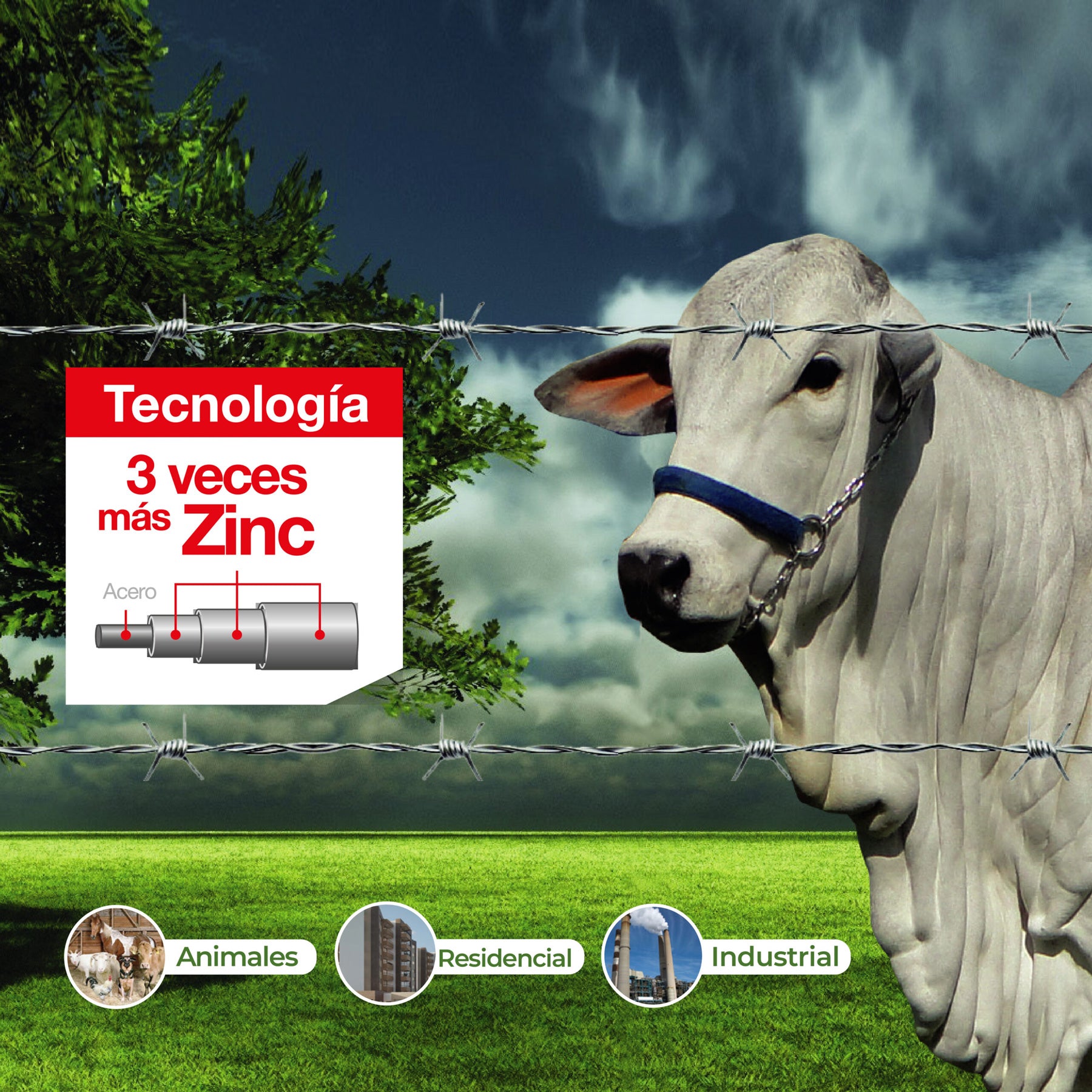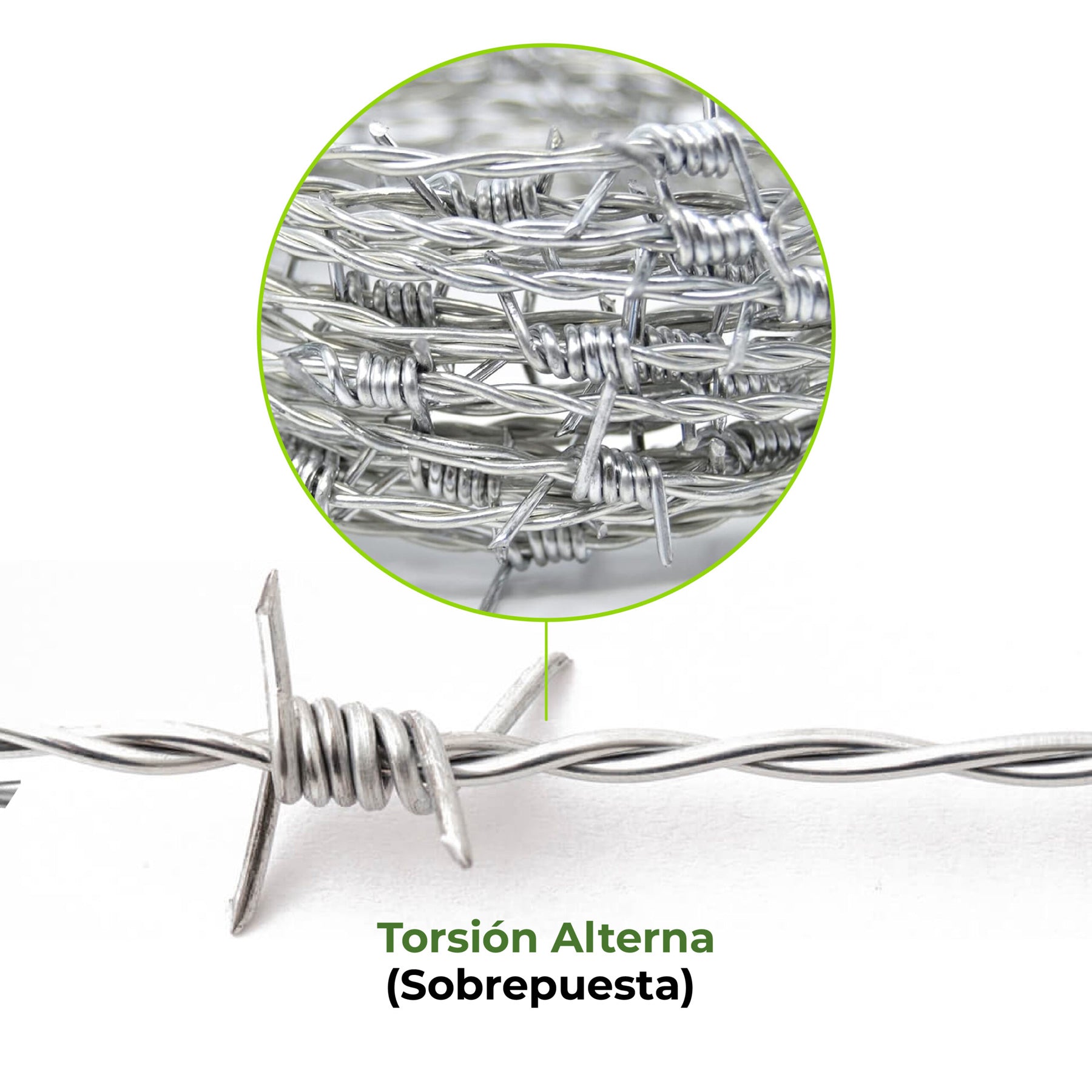 - Alambre de púas con recubrimiento en zinc, resistente y de fácil manejo.