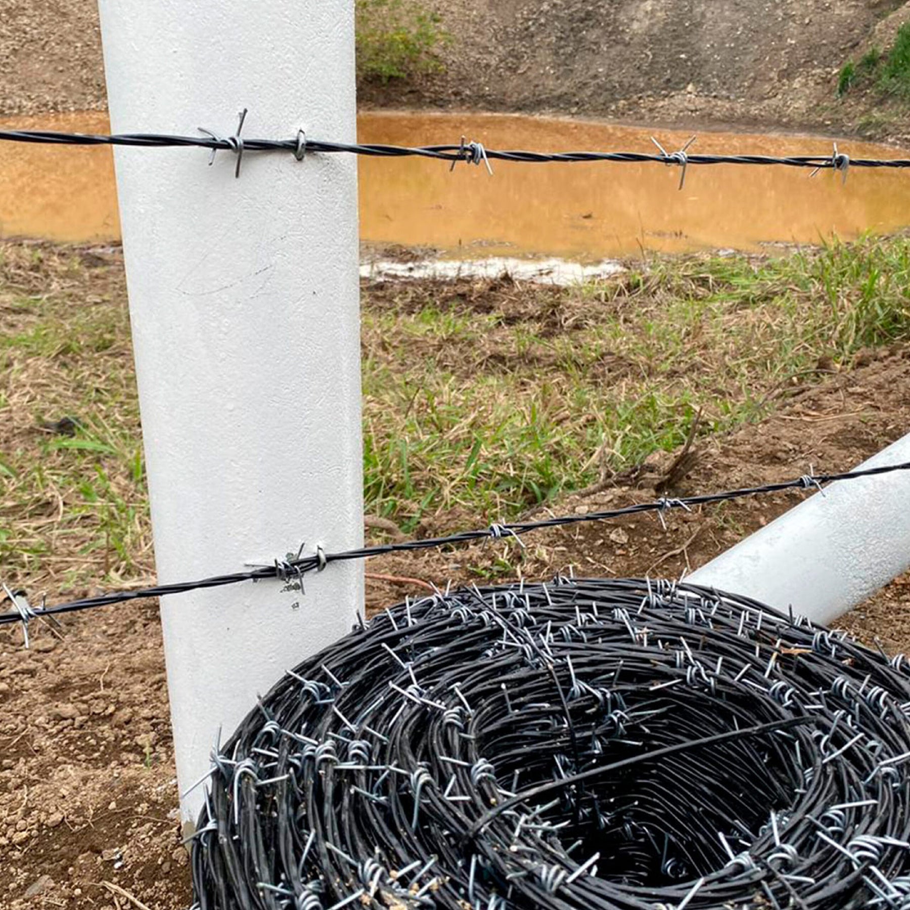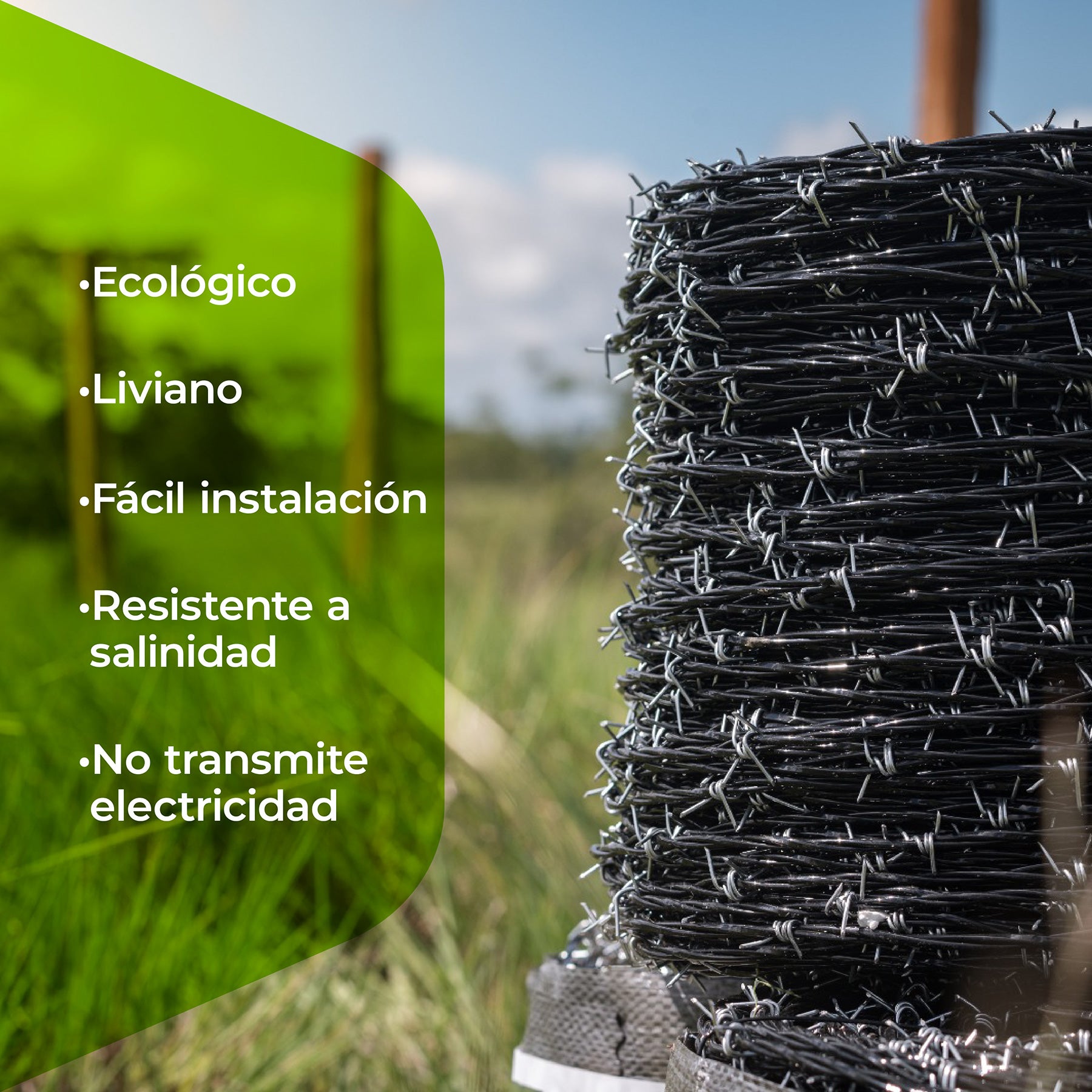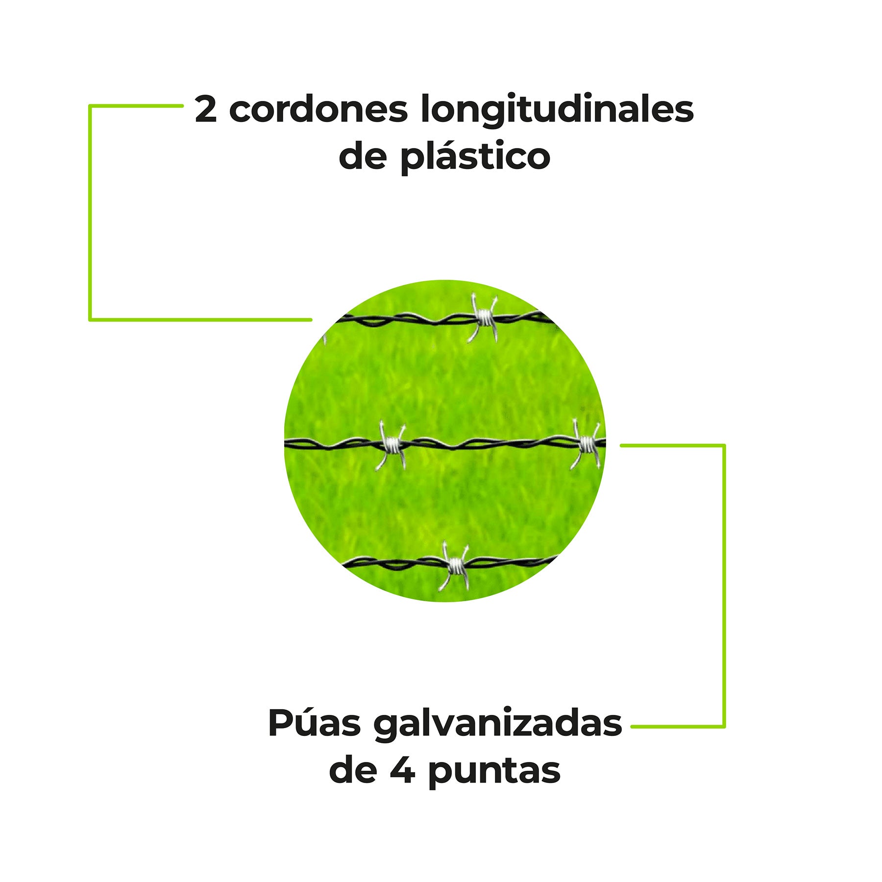 - Alambre de Púas Híbrido trenzado compuesto de dos cordones longitudinales 100% plástico de diámetro promedio de 3.0 mm (sección oval), y púas de cuatro puntas galvanizada sencilla de calibre 12.