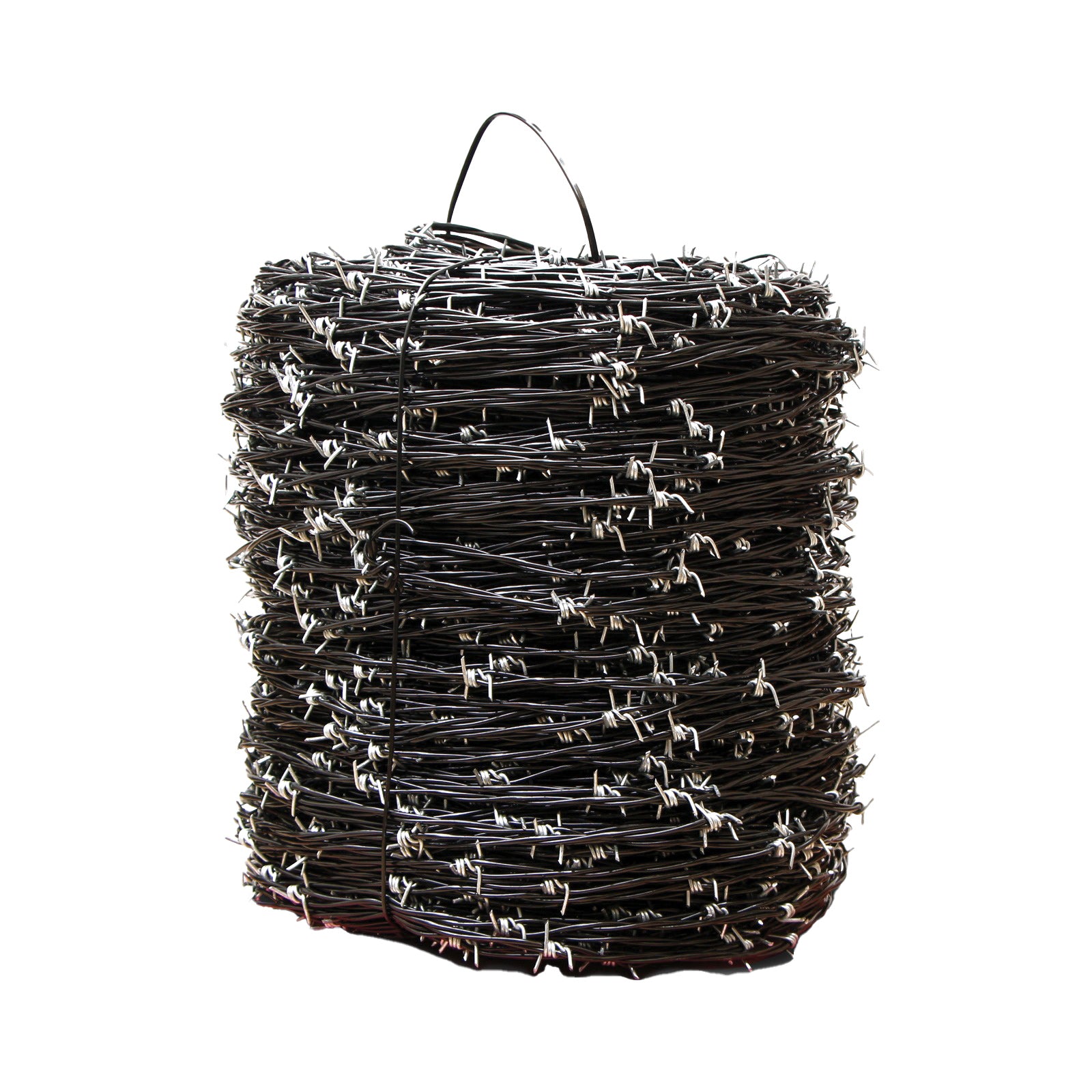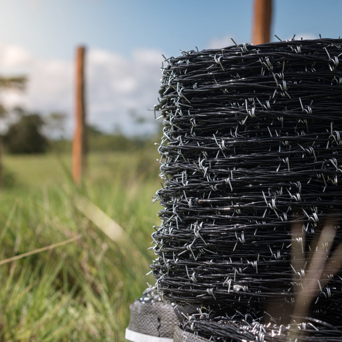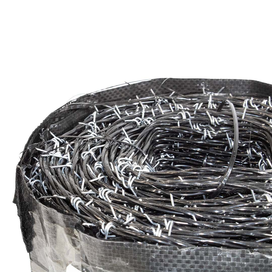 - Alambre de Púas Híbrido trenzado compuesto de dos cordones longitudinales 100% plástico de diámetro promedio de 3.0 mm (sección oval), y púas de cuatro puntas galvanizada sencilla de calibre 12.