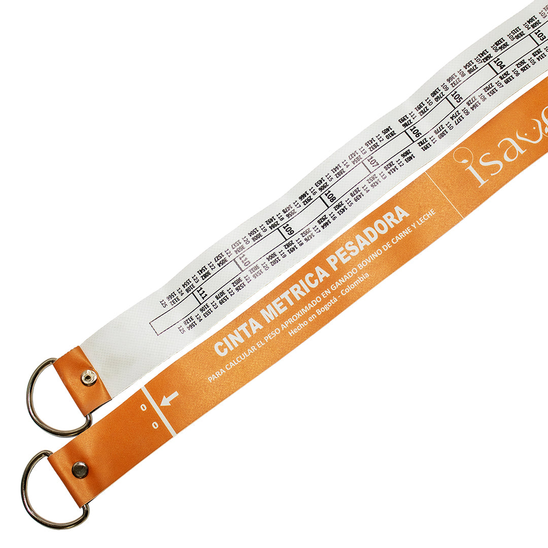 Cinta con datos para pesar cuatro tipos de ganado. Por una cara puede pesar ganado cebú y criollo obteniendo el peso en kilos, libras y arrobas, además de obtener el perímetro torácico del animal dado en cm.