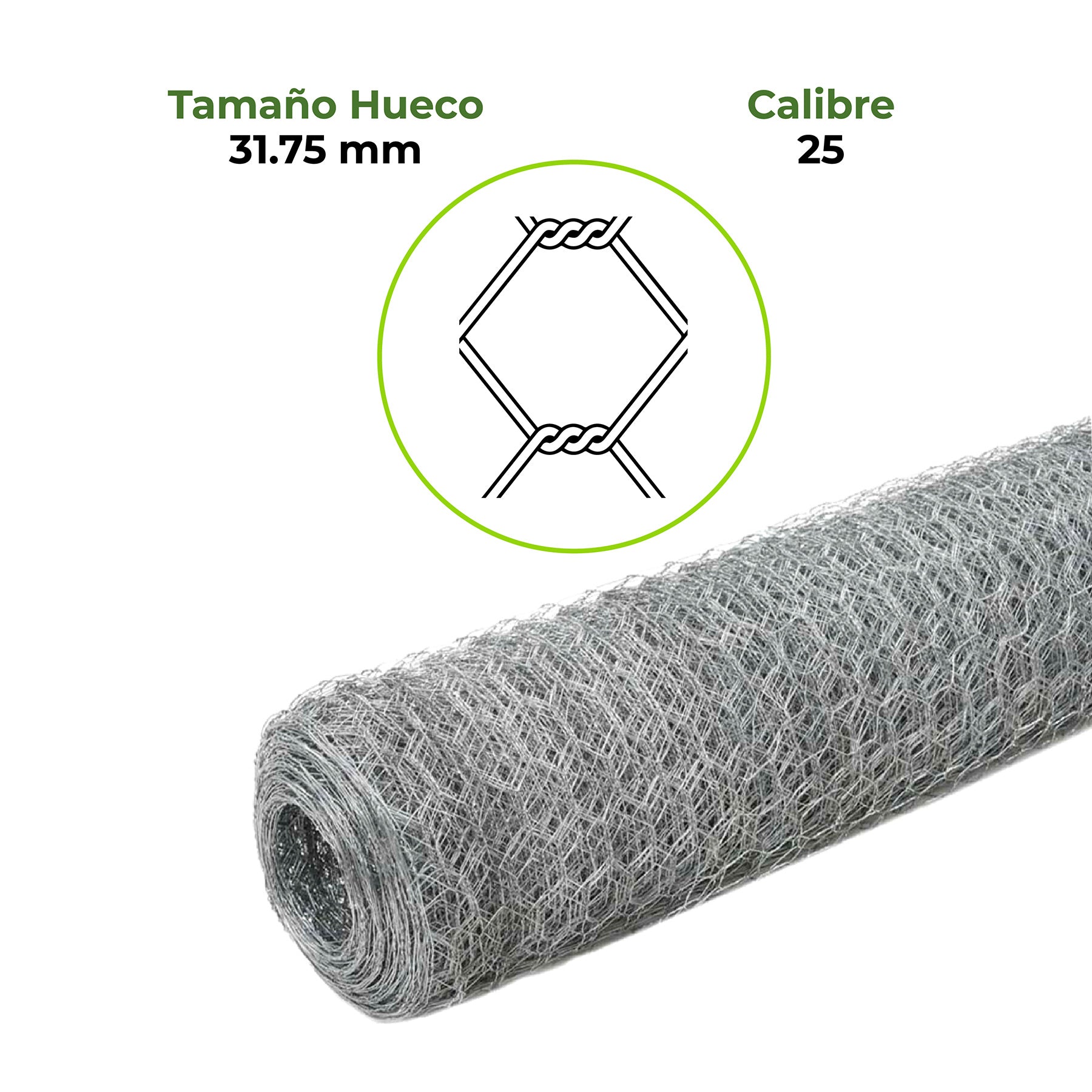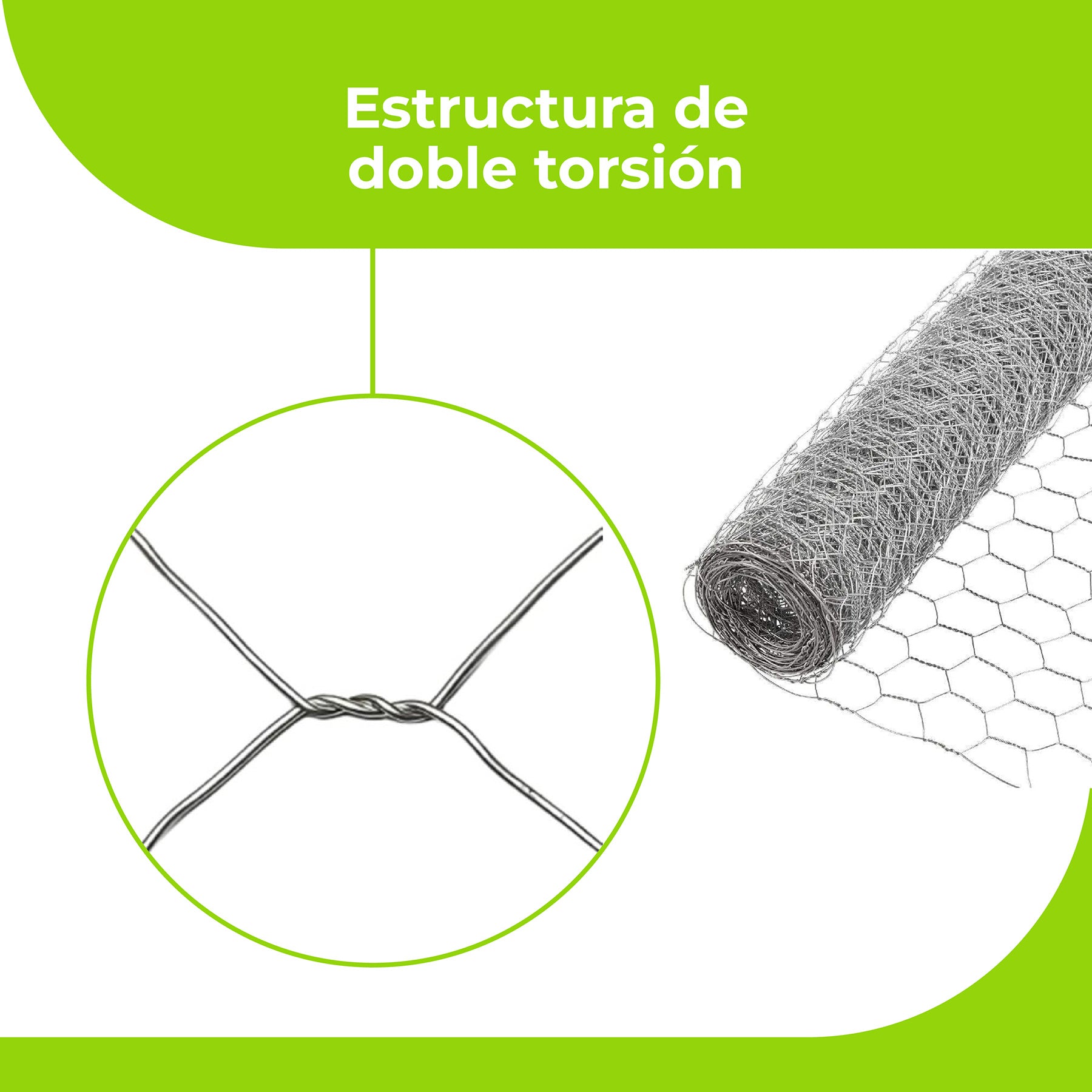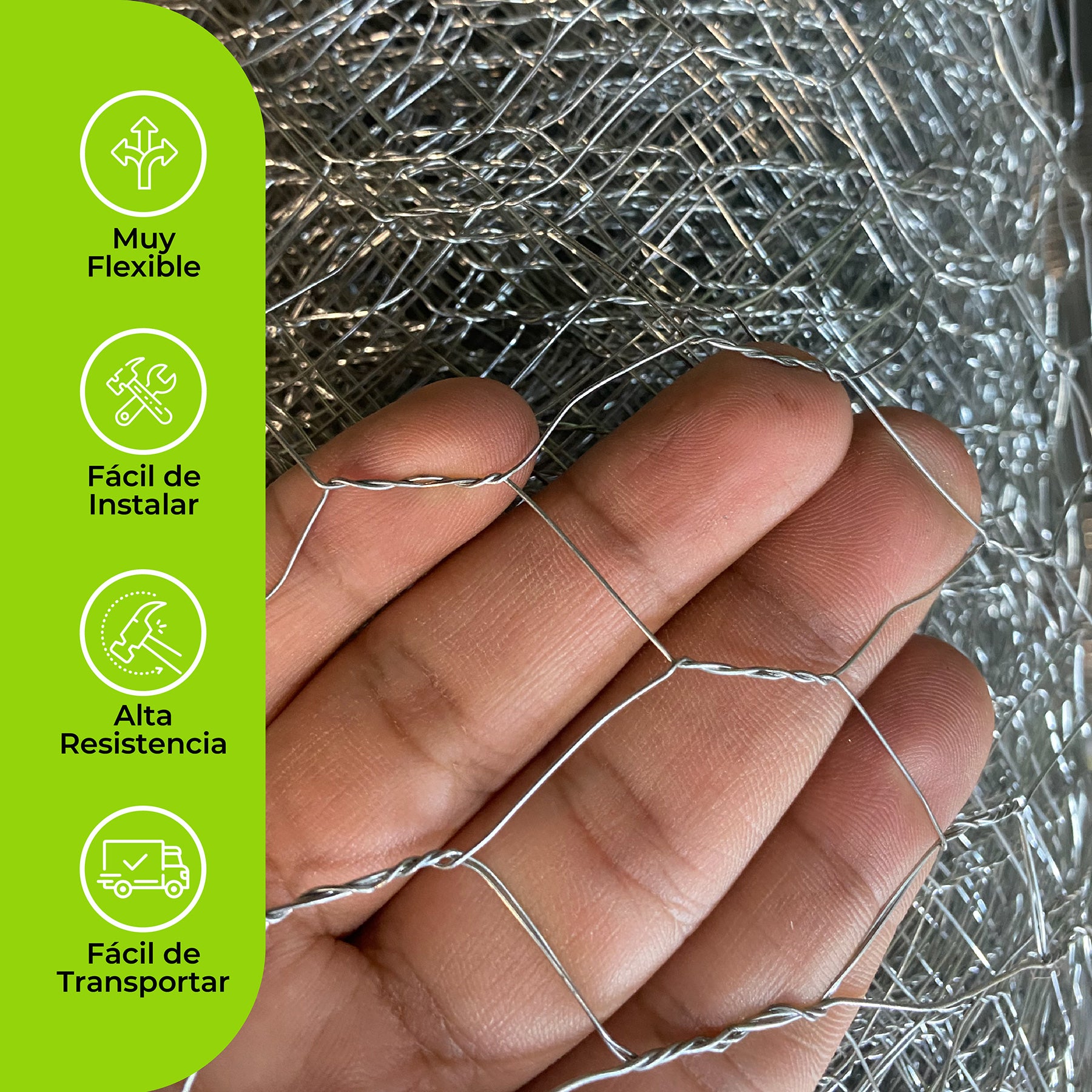 Malla de alambre galvanizado tejido con aberturas hexagonales enlazada en triple torsión, fortalecida con remates laterales. Ideal para instalaciones de producción avícola, animales pequeños, viveros y construcciones civiles. Permite visibilidad hacia el interior del cerramiento.