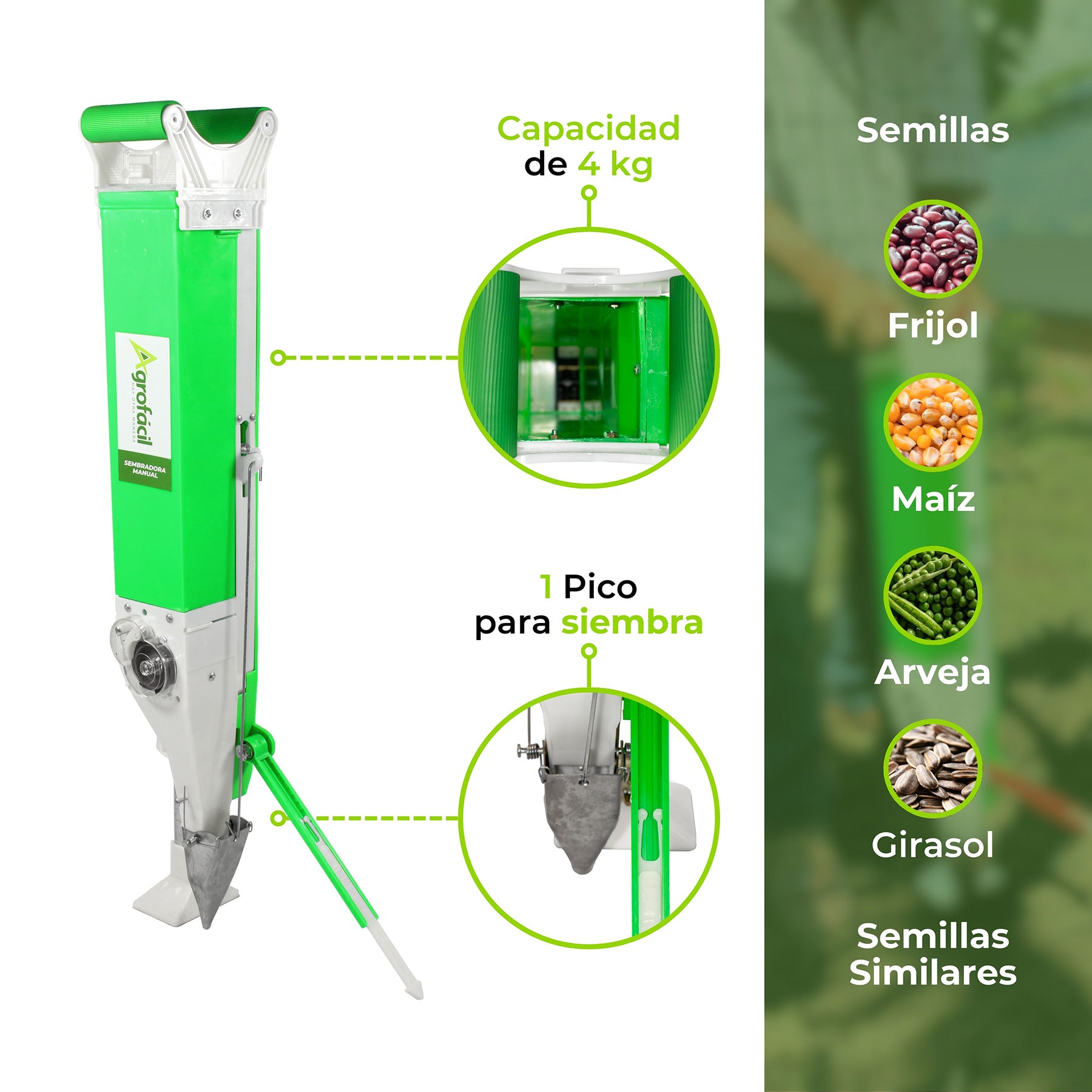 - Capacidad de la tolva hasta 4kg (depende del tipo de semilla).